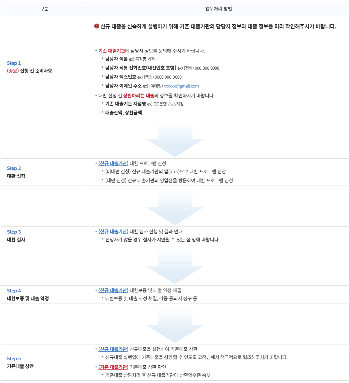 신청절차는 신청 전 준비사항을 확인하신 후 준비하시고 > 대환 신청 > 대환 심사 > 대환보증 및 대출 약정 > 기존대출 상환 절차로 진행됩니다. 아래의 내용을 확인해 보시면 보다 명확히 이해하실 수 있습니다.